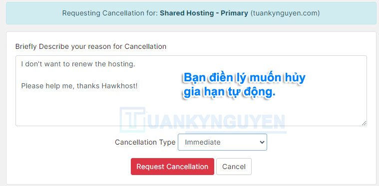 - Immediate: Hủy hosting ngay lập tức và Hawkhost sẽ hoàn tiền cho bạn trước ngày gia hạn dịch vụ.