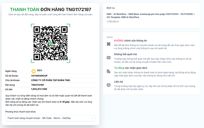 Nhấn Thanh toán để kết thúc đơn hàng mua VPS n8n.